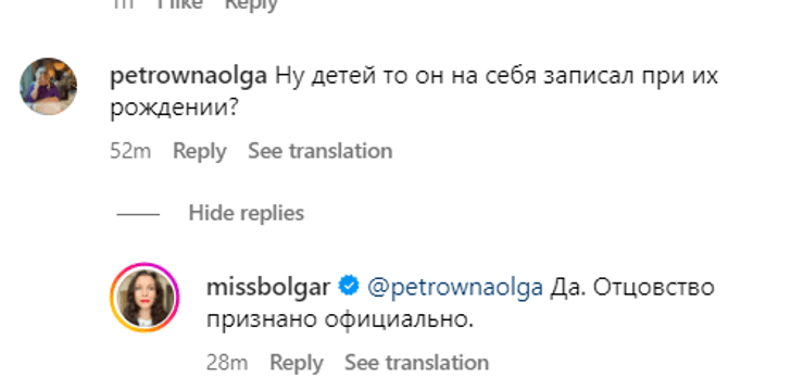 В комментариях Ирина утверждает, что Павел официально признал рождение их детей.