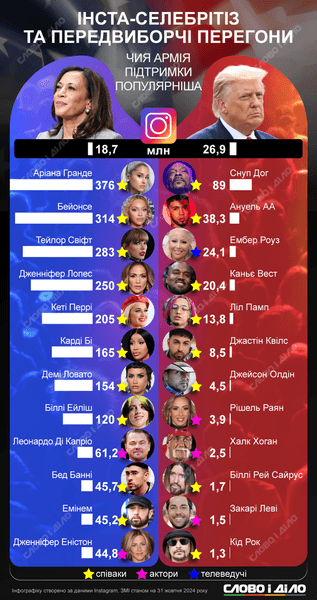 Уже через неделю в США состоятся выборы президента. Между главными претендентами Дональдом Трампом и Камалой Харрис продолжается ожесточенная гонка, во время которой они активно пытаются привлечь на свою сторону известных людей, в частности, звезд шоу-бизнеса. Чья армия фанатов в Instagram больше, говорится в материале "Слово и Дело".
