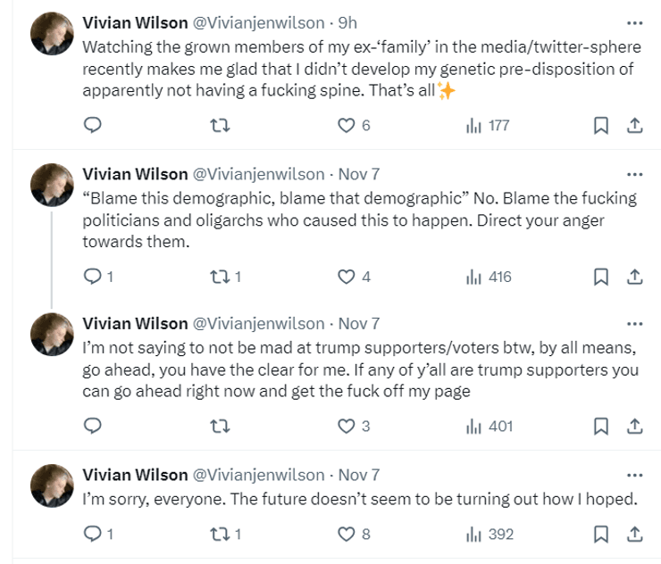 "Мне жаль, все. Кажется, будущее не складывается так, как я надеялась", "Я не говорю, что не нужно злиться на сторонников/избирателей Трампа, конечно, продолжайте, у меня нет претензий. Если кто-то из вас поддерживает Трампа, вы можете прямо сейчас пойти и убраться с моей страницы", "Наблюдая за взрослыми членами моей бывшей "семьи" в медиа/твиттер-сфере в последнее время, я радуюсь, что у меня не развилась генетическая предрасположенность к отсутствию гребаного позвоночника. Вот и все", – заявляет Уилсон.