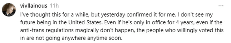 "Я думала об этом некоторое время, но вчера это подтвердилось для меня. Я не вижу своего будущего в Соединенных Штатах. Даже если он будет у власти всего четыре года, даже если антитрансгендерные правила чудесным образом не вступят в силу, люди, которые добровольно проголосовали за это, никуда не денутся в ближайшее время", – говорится в твите.