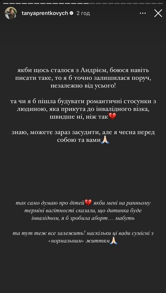 "Знаю, можете сейчас осудить, но я честна перед собой и вами... Так же думаю о детях. Если бы мне на раннем сроке беременности сказали, что ребенок будет инвалидом, я бы сделала аборт... наверное. Но здесь тоже все зависит, насколько эти недостатки совместимы с "нормальной" жизнью", — добавила Татьяна.