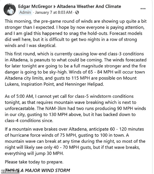 За несколько часов, как несколько крупных пожаров вспыхнули по всей южной Калифорнии, он на своей странице в Facebook забил тревогу о надвигающихся пожарах в Лос-Анджелесе и призвал свое сообщество бежать.