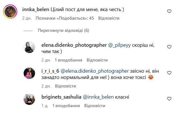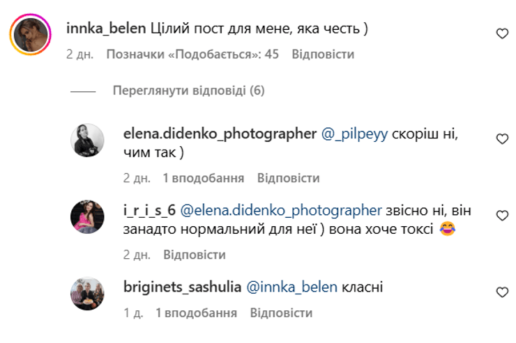 Под фото подписчики начали подозревать пару в романе. В комментариях к фотографии пользователи писали, что Инна и Вадим хорошо выглядят вместе, желали им горячей любви и безграничного счастья.