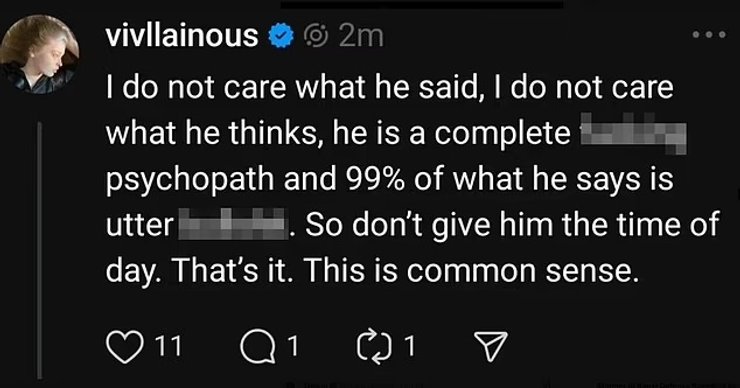 Позже мужчина заявил, что его замечания были "вырваны из контекста". Он заявил, что они с Илоном всегда были в "хороших отношениях". Однако Вивиан оправдания деда не впечатлили. Она заявила своим более чем 140 000 подписчиков, что он "полный е***ый психопат и 99% того, что он говорит, – полная чушь".