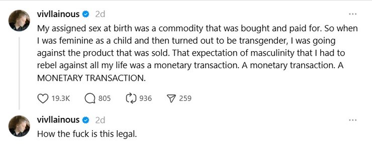 "Мой назначенный при рождении пол был товаром, который покупался и оплачивался. Поэтому, когда я была женственной в детстве, а затем оказалась трансгендерной, я шла против проданного продукта. Это ожидание мужественности, против которого мне пришлось восставать всю свою жизнь, было денежной сделкой. Денежной сделкой. ДЕНЕЖНОЙ СДЕЛКОЙ", – написала она.