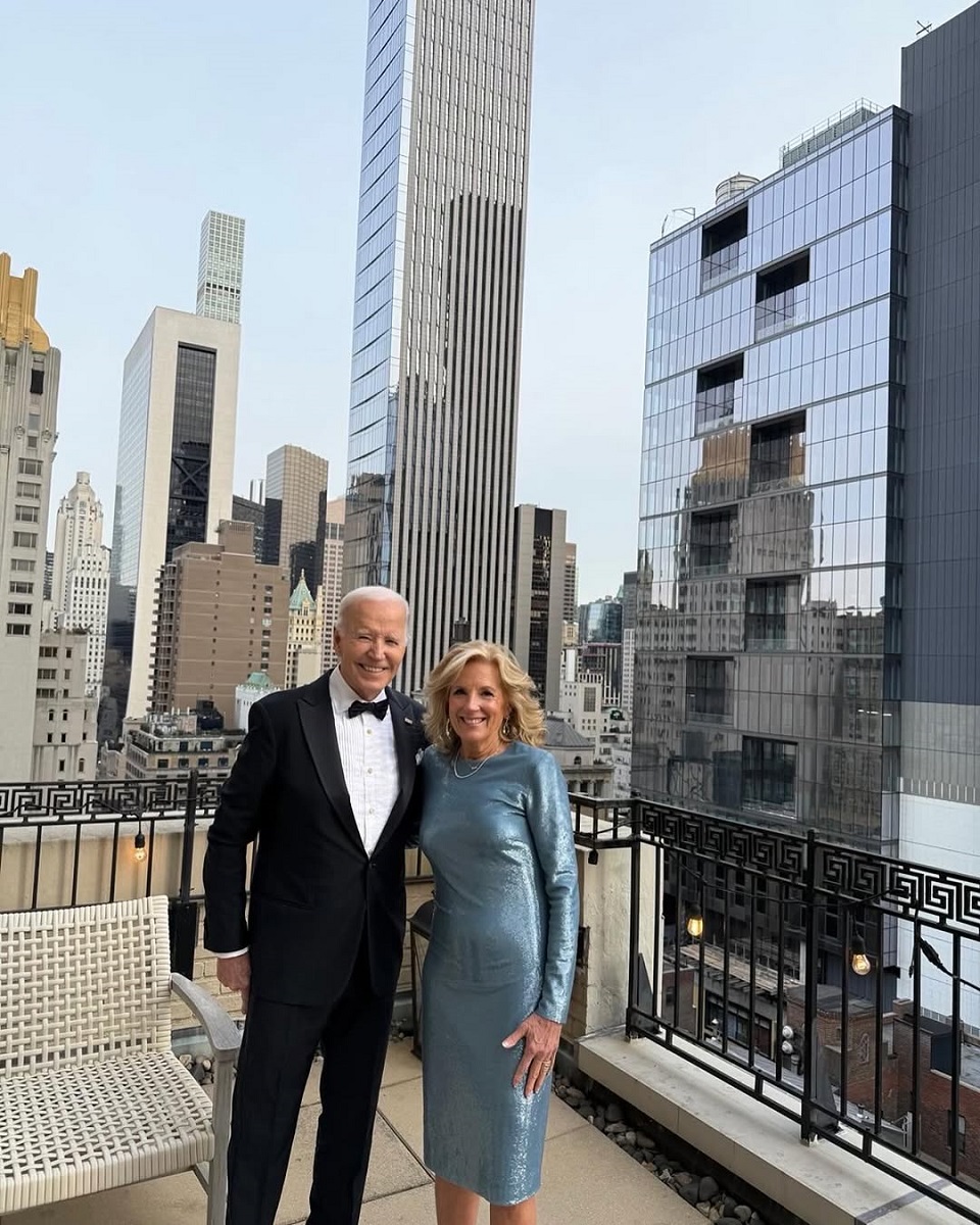 Байден надел смокинг, а Джилл — элегантное бирюзовое платье, и пара позировала для фотографии на крыше небоскреба Манхэттена перед началом шоу.