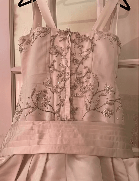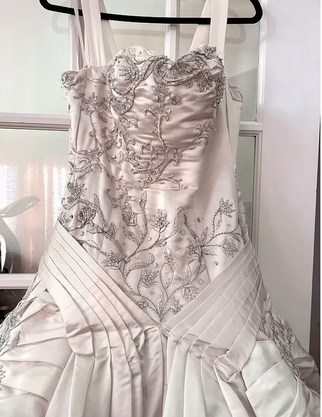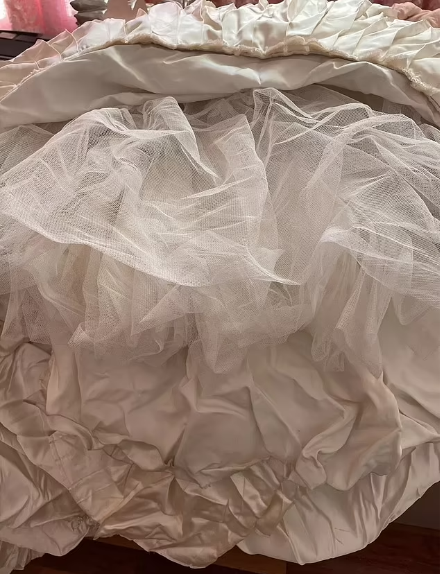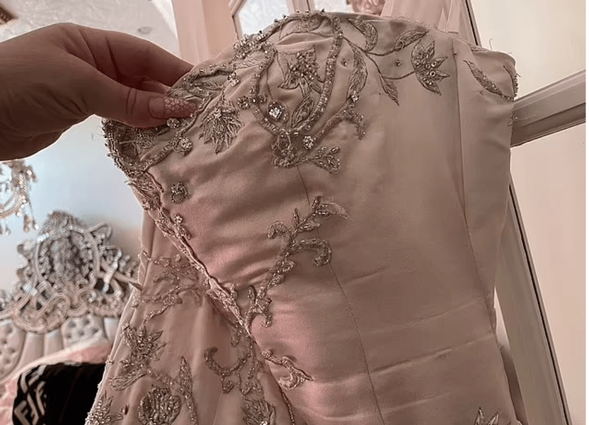 "Плюс к этому был добавлен новый слой ткани на спине платья и бретельках, поскольку моя грудь намного больше, чем у Мелании", – объяснила продавец. Она сказала, что платье, которое надевали всего два раза, теперь имеет размер 4–6. Но если бы невеста сняла заднюю часть, оно снова стало бы размером Мелании (0–2).