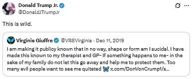 "Я не верю, что Вирджиния Джуффре покончила с собой. Так же, как я не верю, что Джеффри Эпштейн покончил с собой. Сначала она ла в автокатастрофу, а теперь говорят, что покончила с собой? Похоже, кто-то хотел ее смерти", – написала она в Х.