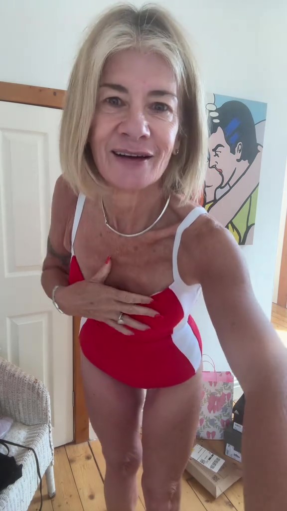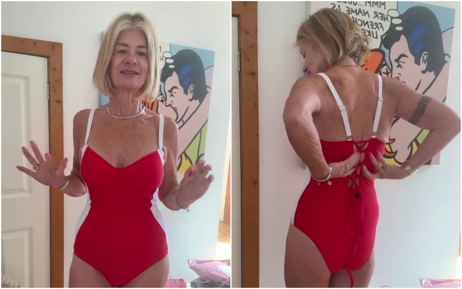 60-летняя блогерша Джулия Эллен прославилась в интернете, продемонстрировав красный купальник с белыми акцентами, который визуально создает силуэт "песочных часов".