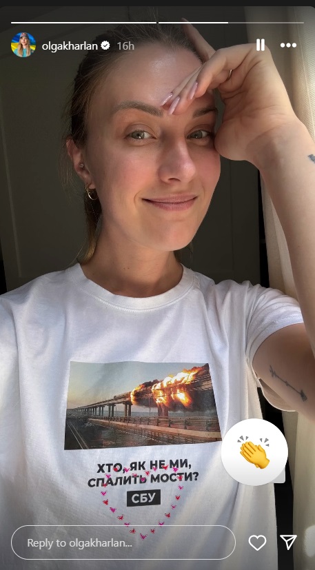 "Хто, як не ми, спалить мости? СБУ" — такая надпись сопровождает принт. Предложение является фразой из песни Христины Соловий, но употреблено в ином контексте.