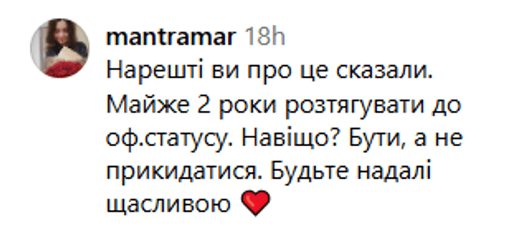 "Наконец-то вы об этом сказали. Почти 2 года растягивать до оф.статуса. Зачем? Быть, а не притворяться. Будьте в дальнейшем счастливы".