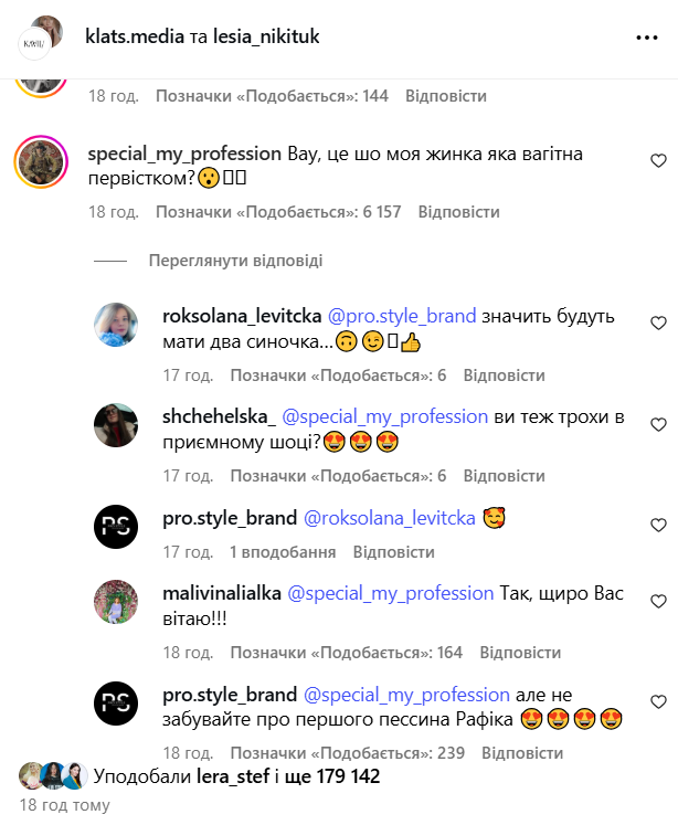 Никитюк поздравил почти весь украинский шоу-бизнес. Телеведущая Маша Ефросинина написала: "Вот это я понимаю мастерство втягивать живот все это время. Радуюсь невероятно за вас, за тебя, моя невероятная девочка". Певица MamaRika также оставила свои пожелания: "Поздравления, красавчик! Легко пройти этот крутой и интересный путь".