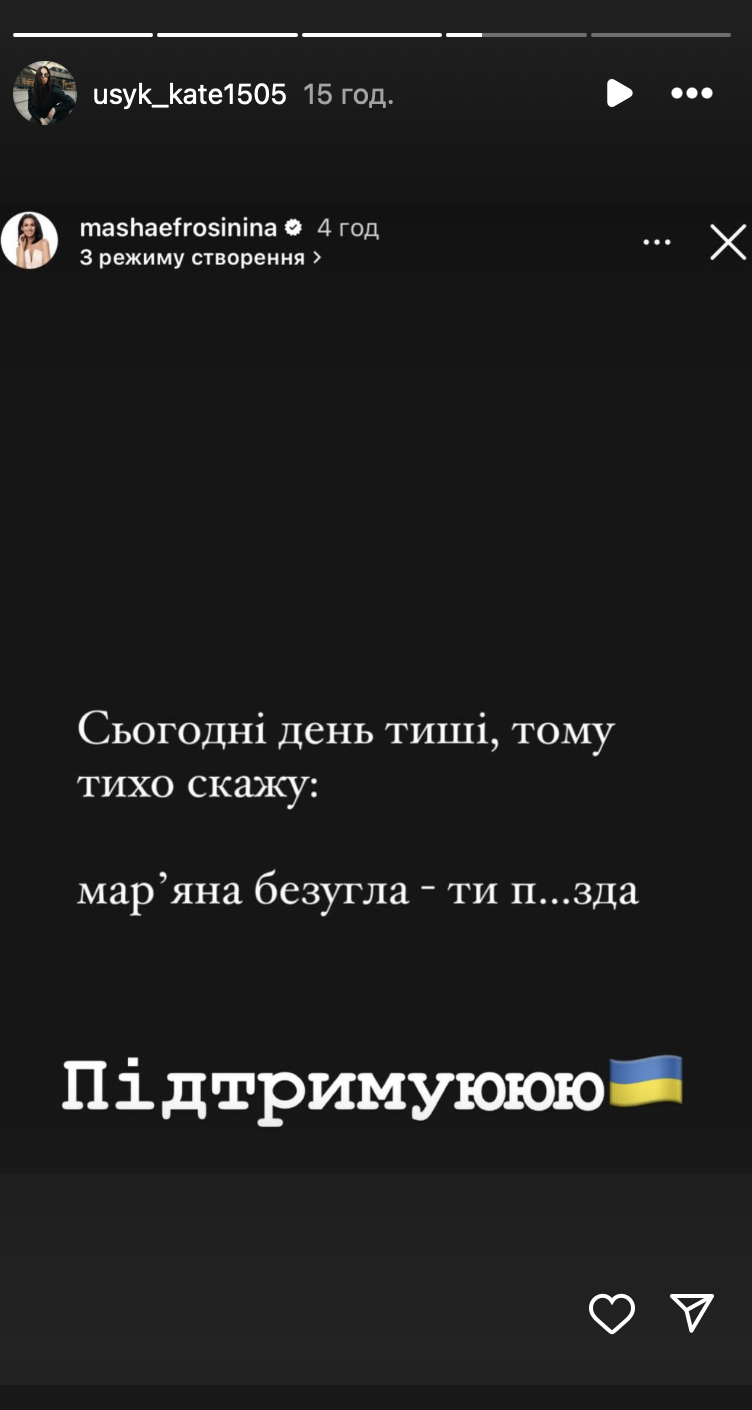 Жена боксера и чемпиона Александра Усика перепостила заявление Маши Ефросининой и отметила, что соглашается с этими словами.