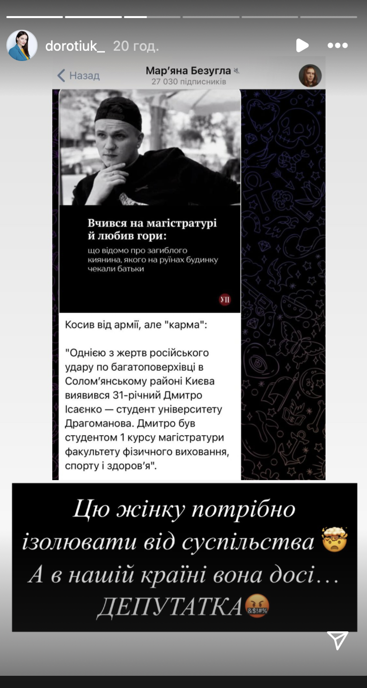 В посте в своем аккаунте в Telegram нардеп после массированного обстрела Киева 17 июня опубликовала ссылку на материал о погибшем Дмитрии Исаенко. В нем говорится, что 31-летний мужчина был студентом первого курса магистратуры Украинского государственного университета имени Михаила Драгоманова.