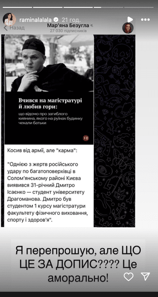 Участник Евровидения и украинский певец MÉLOVIN отметил: "У каждого из нас — своя война. Но боль в стране — общая. И знаете, мы так не выживем. Не в этой стране. Не с такими словами. Не с таким тоном. Осуждать человека после смерти, тем более гражданскую жертву войны, называть это "кармой" — это не о защите армии. Это об утрате чего-то гораздо более глубокого. Сочувствия. Сердца. Человечности".