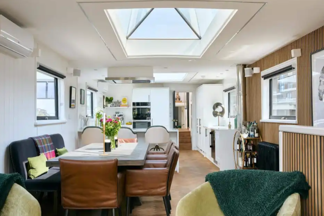 Отремонтированная баржа вмещает четыре спальни с собственными ванными, просторный открытый салон с кухней, главную гостиную с деревянными панелями и уютным камином. Главная спальня оснащена гардеробной и роскошной ванной с отдельным душем.