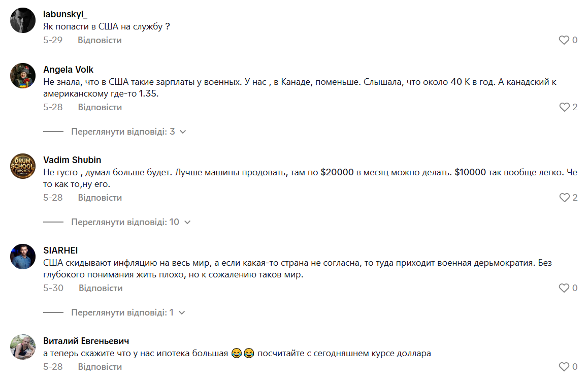 • Другая зрительница добавила: "Не знала, что в США такие зарплаты у военных. У нас, в Канаде, меньше. Слышала, что около 40 тысяч в год. Канадский доллар к американскому где-то 1,35";