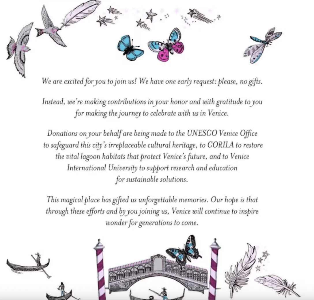 Так, приглашение на "свадьбу века" оформлено в нежных пастельных оттенках, украшено перьями, бабочками и звездной пылью. На приглашении изображен мост Риальто с гондолами — один из самых известных символов города на воде в Италии. Более того, молодожены попросили отказаться от подарков, призывая сделать взносы в поддержку нескольких важных инициатив в Венеции: в офис ЮНЕСКО для сохранения исторического наследия города; в CORILA — для охраны экосистемы венецианской лагуны и в Венецианский международный университет для развития экологических и образовательных проектов.