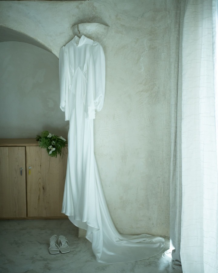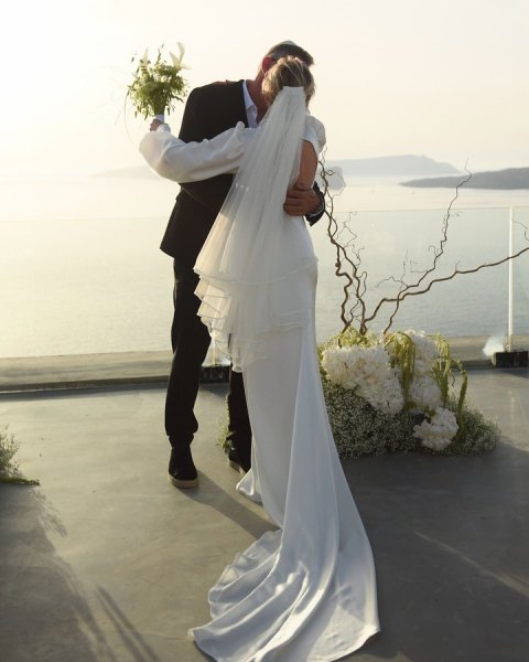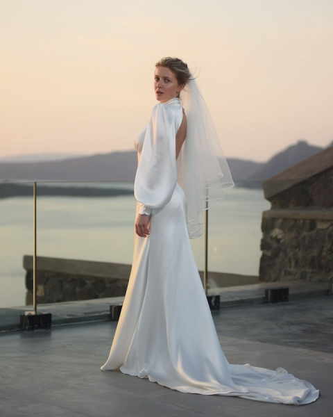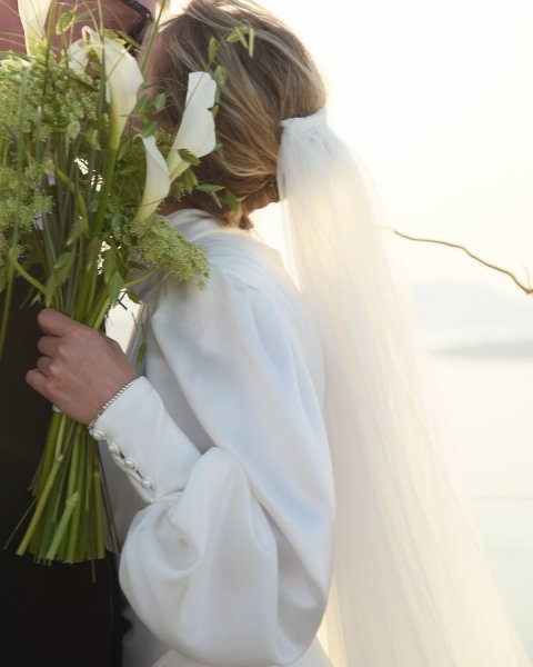 Из снимков понятно, что для тайной свадьбы певица выбрала минималистичный, но элегантный образ. Ее белое платье было закрытым спереди, но имело открытую спину. Акцентами стали объемные рукава и длинный шлейф.