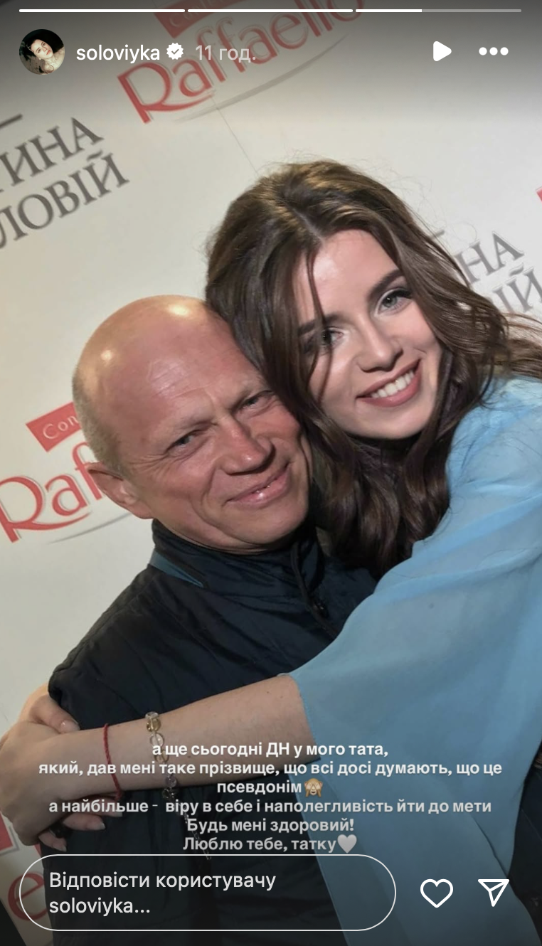"А еще сегодня ДН (день рождения, — Ред.) у моего папы, который дал мне такую фамилию, что все до сих пор думают, что это псевдоним. А больше всего — веру в себя, настойчивость идти к цели. Будь мне здоров. Люблю тебя, папа", — написала Христина, показав архивное фото с именинником.