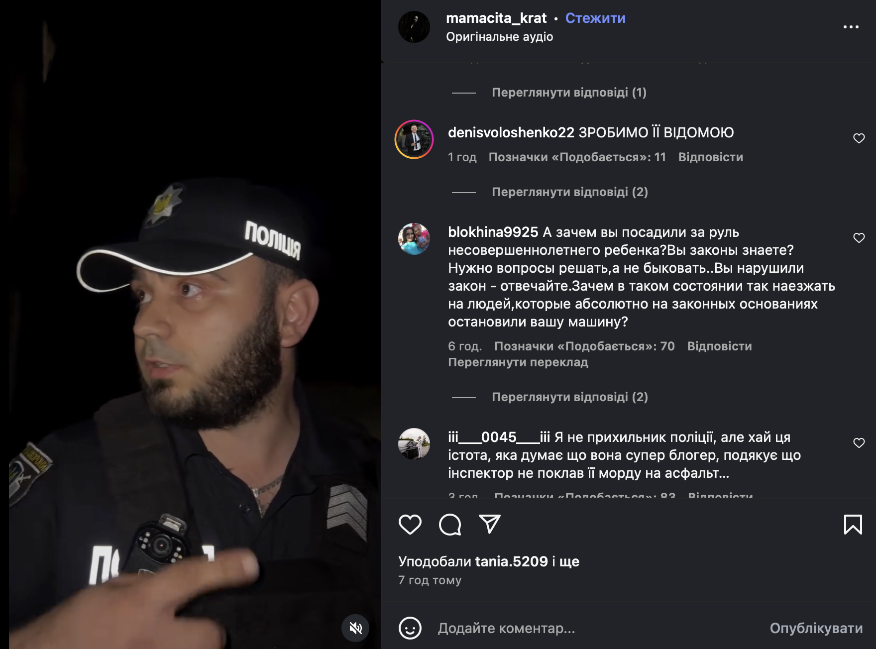 • "Нет, вас остановили за нарушение комендантского часа, вы были пьяны, вы передали машину малолетнему, которому не разрешили сесть за руль. В машине сидел маленький ребенок и смотрел на все это. Вопрос, почему вы запостили это видео сейчас? Это вас не оправдывает и не компрометирует полицейских".