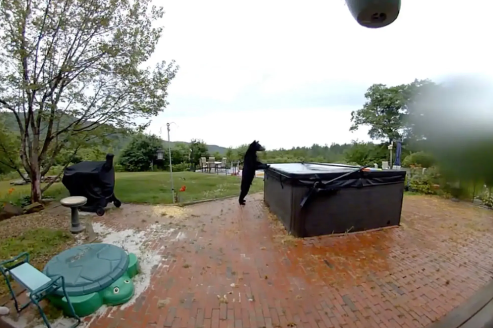 Когда раздался звонок, зверь отступил и на мгновение остановился, а затем вернулся, чтобы продолжить исследование патио. Заметив джакузи, он положил лапы на крышку, тыкая в нее носом. Когда крышка не поддалась, великан сдался и пошел глубже во двор.