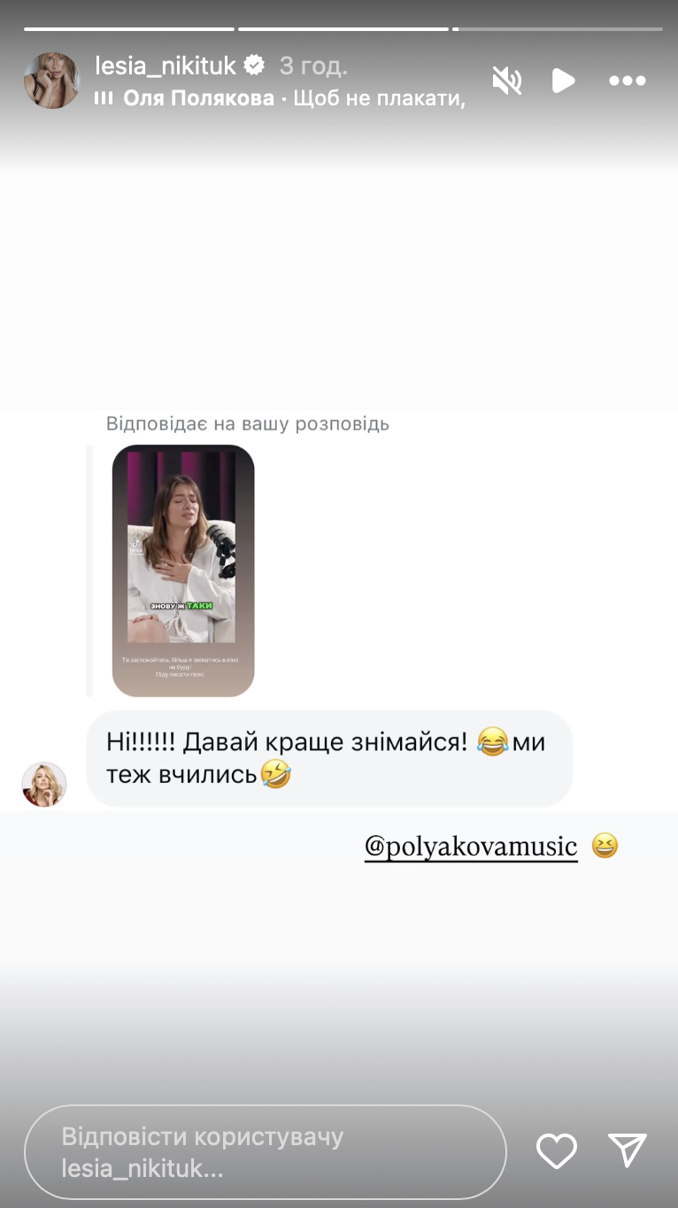 Тем временем певица Оля Полякова ответила Никитюк и посоветовала ей лучше сниматься, ведь музыканты также обучались своей профессии.