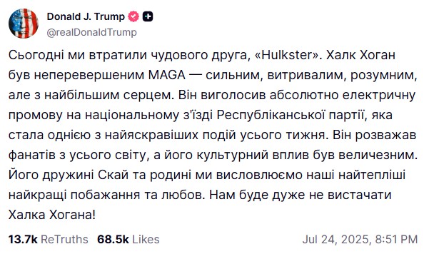 Сообщение Трампа о смерти Хогана появилось вечером 24 июля, через несколько часов после сообщений медиа о трагическом событии. Как выяснилось, политик считал рестлера лучшим MAGA. По его словам, особенно удивительным было выступление Халка на съезде республиканцев: речь была эклектичной, а событие ярким.
