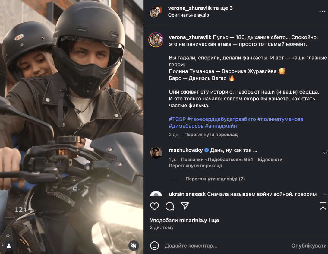 - "Сначала мы называем войну войной войной, говорим какая плохая Россия и как жаль людей из Украины, а теперь рекламируем клипы ВК, снимаемся в России в российском сериале. И на секунду человеку 27 лет. Может уже пора определиться?".