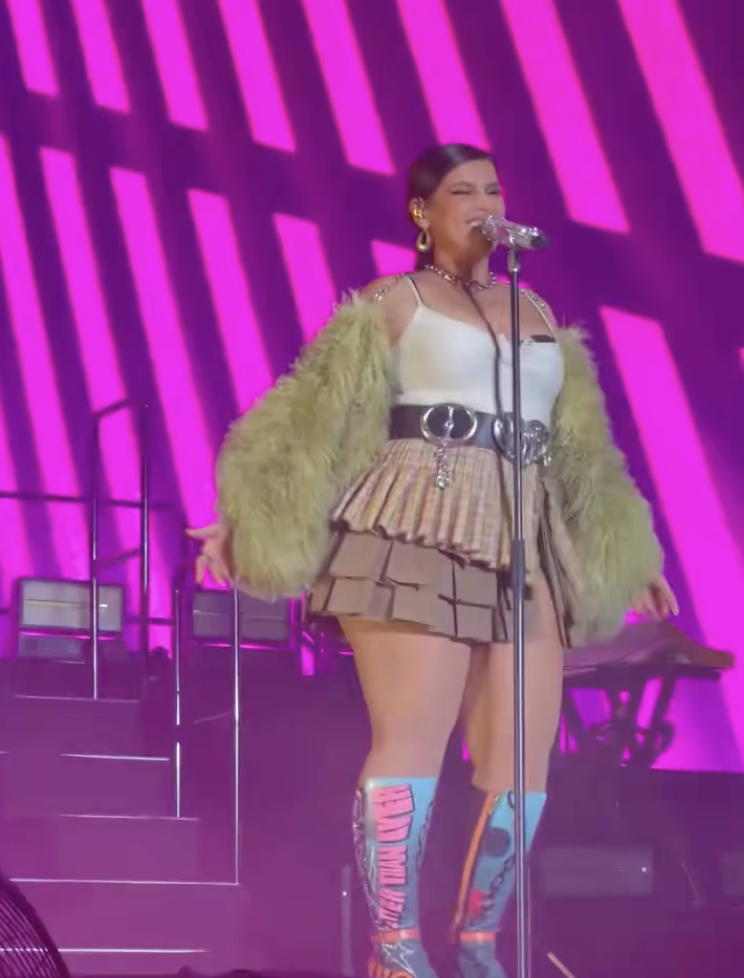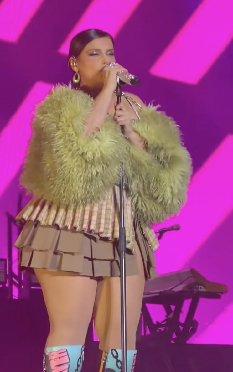 На сцену Нелли вышла в мини-юбке, топе и дополнила образ фисташковой шубкой.