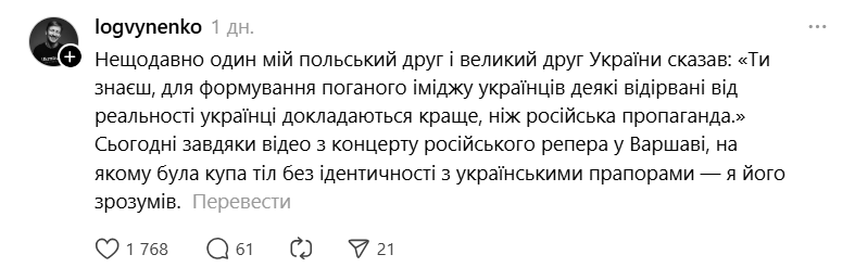 "Сегодня благодаря видео с концерта российского рэпера в Варшаве, на котором была куча тел без идентичности с украинскими флагами, я его понял", — отметил он.