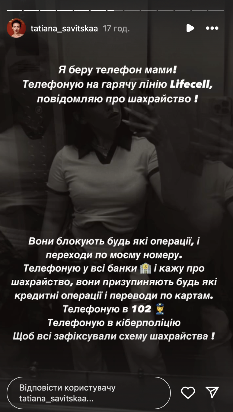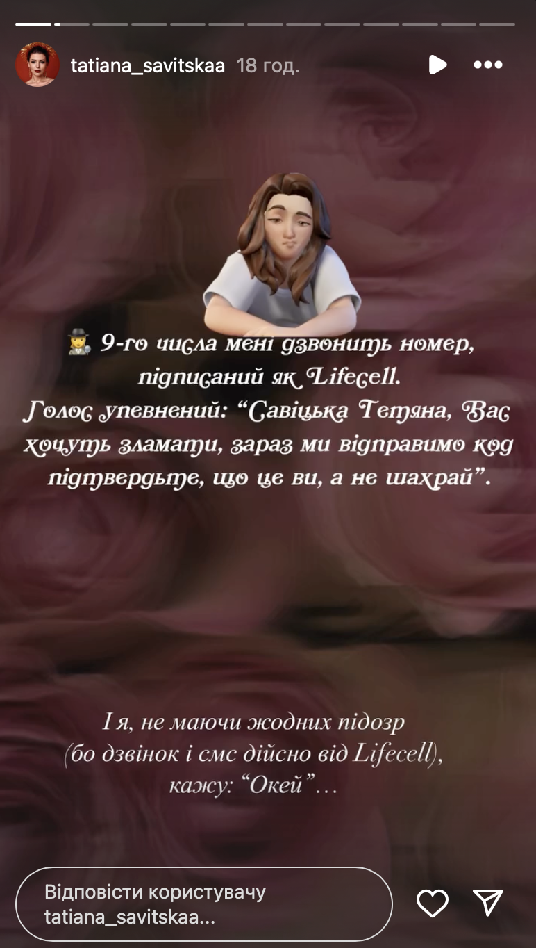 "Голос уверен: "Савицкая Татьяна. Вас хотят взломать, сейчас мы отправим код подтвердите, что это вы, а не мошенник". И я, не имея никаких подозрений, потому что звонок и смс действительно от Lifecell, говорю "Окей", — рассказала блогерша.