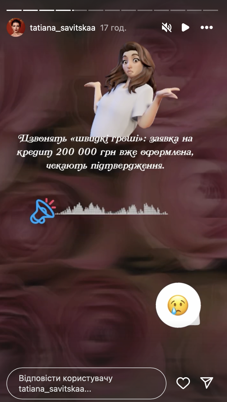 "Звонит "ШвидкоГроші": заявка на кредит 200 000 грн уже оформлена, ждут подтверждения", — рассказывает Савицкая.