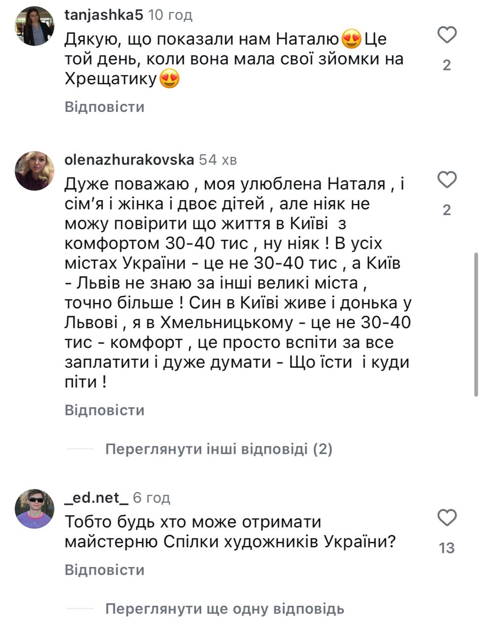 В комментариях под видео большинство пользователей искренне восхищались Натальей Могилевской и отмечали ее искренность. В то же время некоторые зрители усомнились, что певице действительно хватает 30-40 тысяч гривен на комфортную жизнь в Киеве. Один из комментаторов написал, что за такую сумму "можно только успеть оплатить все необходимое и тщательно думать, что есть и куда пойти".