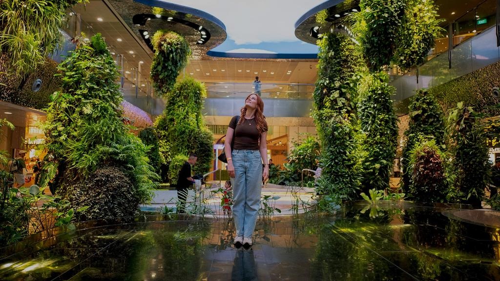 Она показала, что посетила "Дождевой вихрь" в торговом комплексе Jewel аэропорта — впечатляющий 40-метровый водопад среди джунглей.
