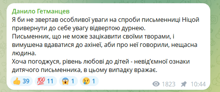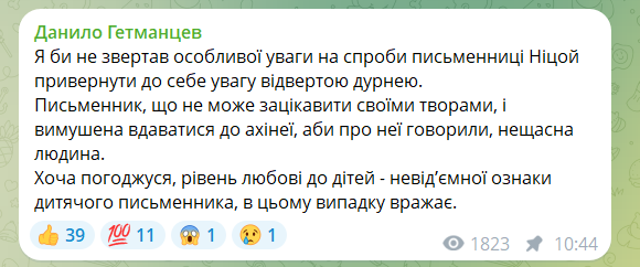 Заявления писательницы Ларисы Ницой относительно правильного воспитания украинских детей народный депутат Даниил Гетманцев считает откровенной глупостью и попыткой привлечь к себе внимание.