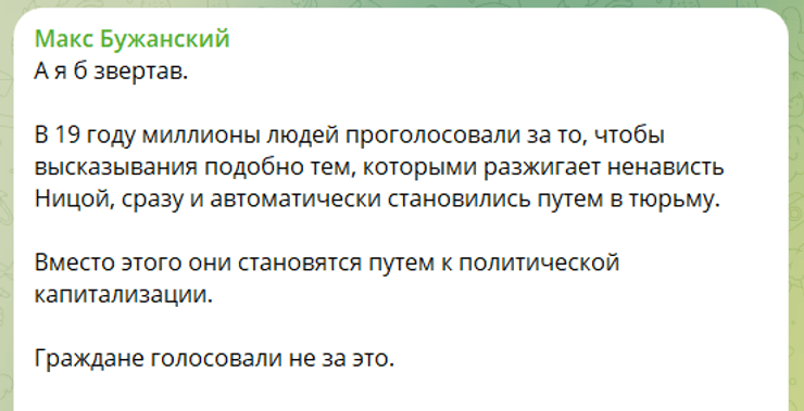 По его мнению, в 2019 году миллионы людей проголосовали за то, чтобы высказывания подобно тем, которыми разжигает ненависть Ницой, "сразу и автоматически становились путем в тюрьму".