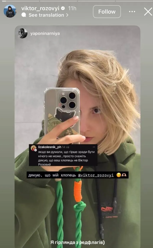 Новая партнерша юмориста также не осталась в стороне и отреагировала на хейт в социальных сетях. Одна из пользовательниц написала: "Если вы думали, что хуже измены быть ничего не может, просто скажите спасибо, что ваш парень не Виктор Розовый". На это девушка иронично ответила, что рада строить с ним отношения.