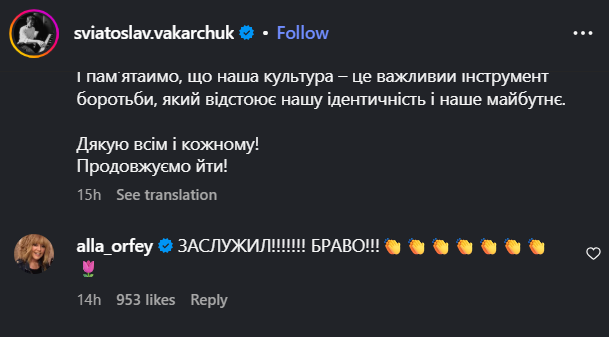 Алла Пугачева написала комментарий под сообщением Святослава Вакарчука. Российская артистка поздравила его с получением украинской государственной награды.