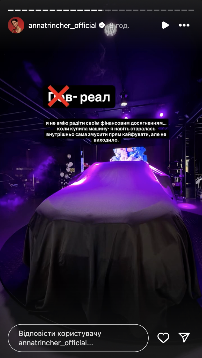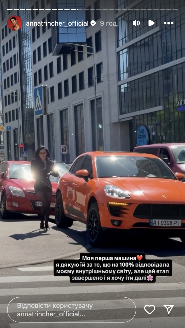"Я помню, как мечтала о первой машине. Ждала, представляла этот момент. И это настоящее чудо — когда осуществляются твои мечты. Сейчас, после долгого пути трансформаций, переосмыслений и возрождения, я могу уверенно сказать: подарки от других никогда не сравнятся с тем, что ты даришь себе сам. Я купила машину. Именно ту, которую хотела. Эта машина — моя награда за то, что когда-то я выбрала свой путь и не сошла с него, как бы ни было трудно", — отметила Тринчер.