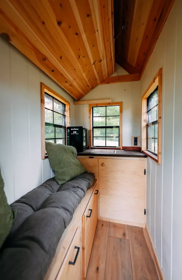 Жилье оснащено компактной системой кондиционирования и отопления за $600, складной кроватью на мансарде, мини-холодильником, мойкой под ореховой столешницей и внешней душевой системой.