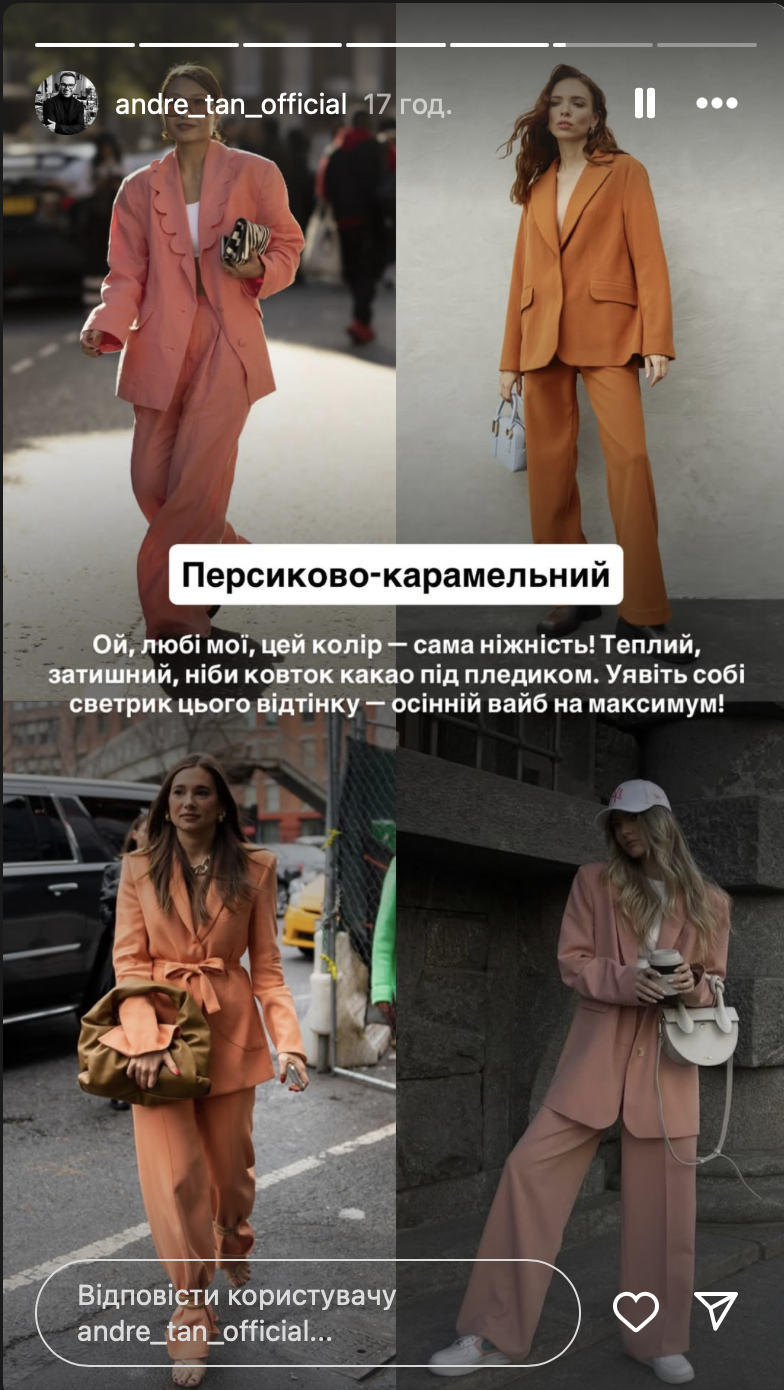 Модельер показал, как носить топ 4 цвета осени 2025 года. В своем Instagram Андре Тан продемонстрировал варианты сочетания вещей в стильных образах.