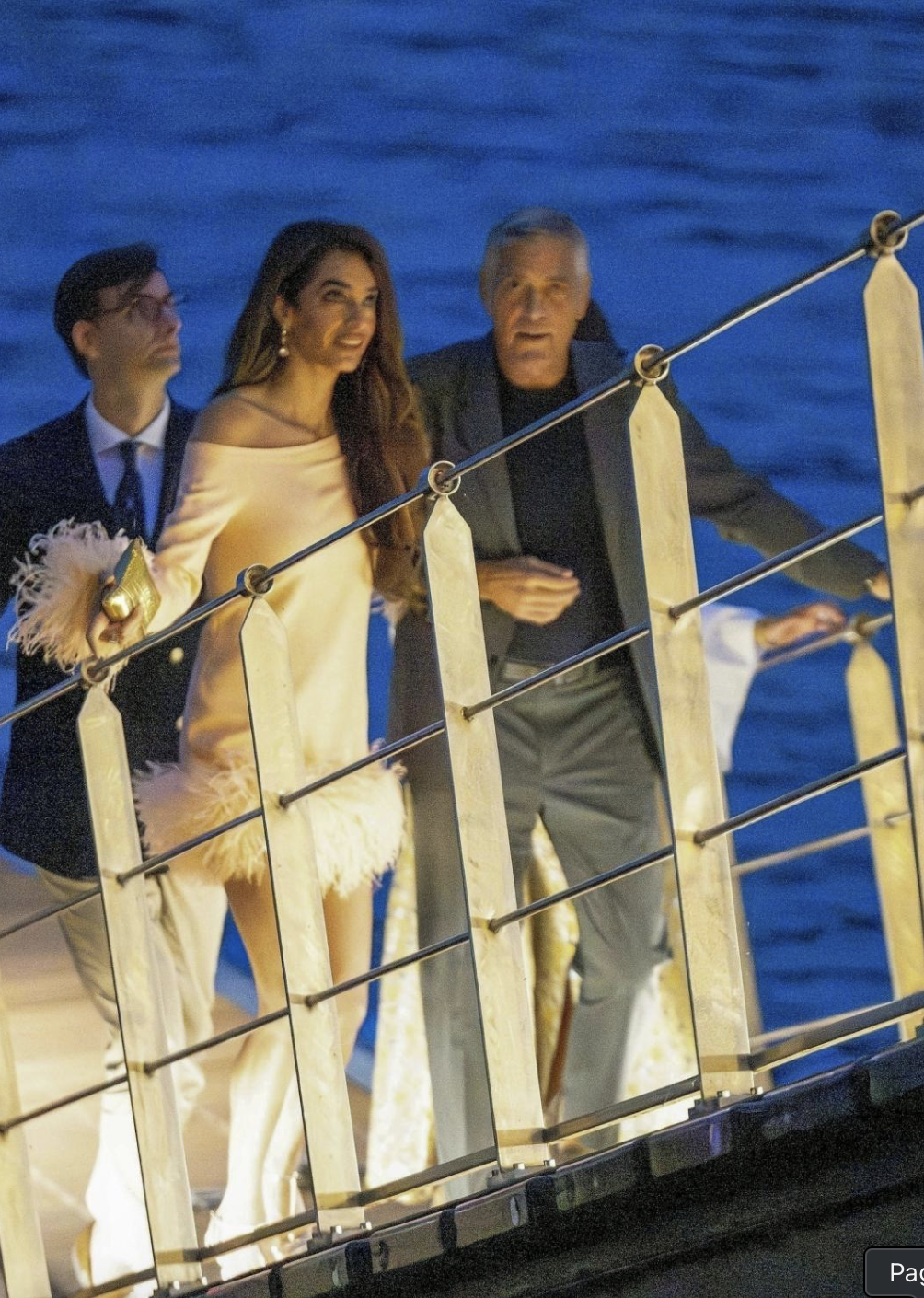 Тем временем Джордж Клуни надел стильный темно-серый костюм с черной футболкой. Для своего вечернего свидания Клуни прибыли на лодке в Тремеццо, где к ним присоединилась актриса Шейлин Вудли и группа друзей. Они направлялись в ресторан на берегу озера на ужин.