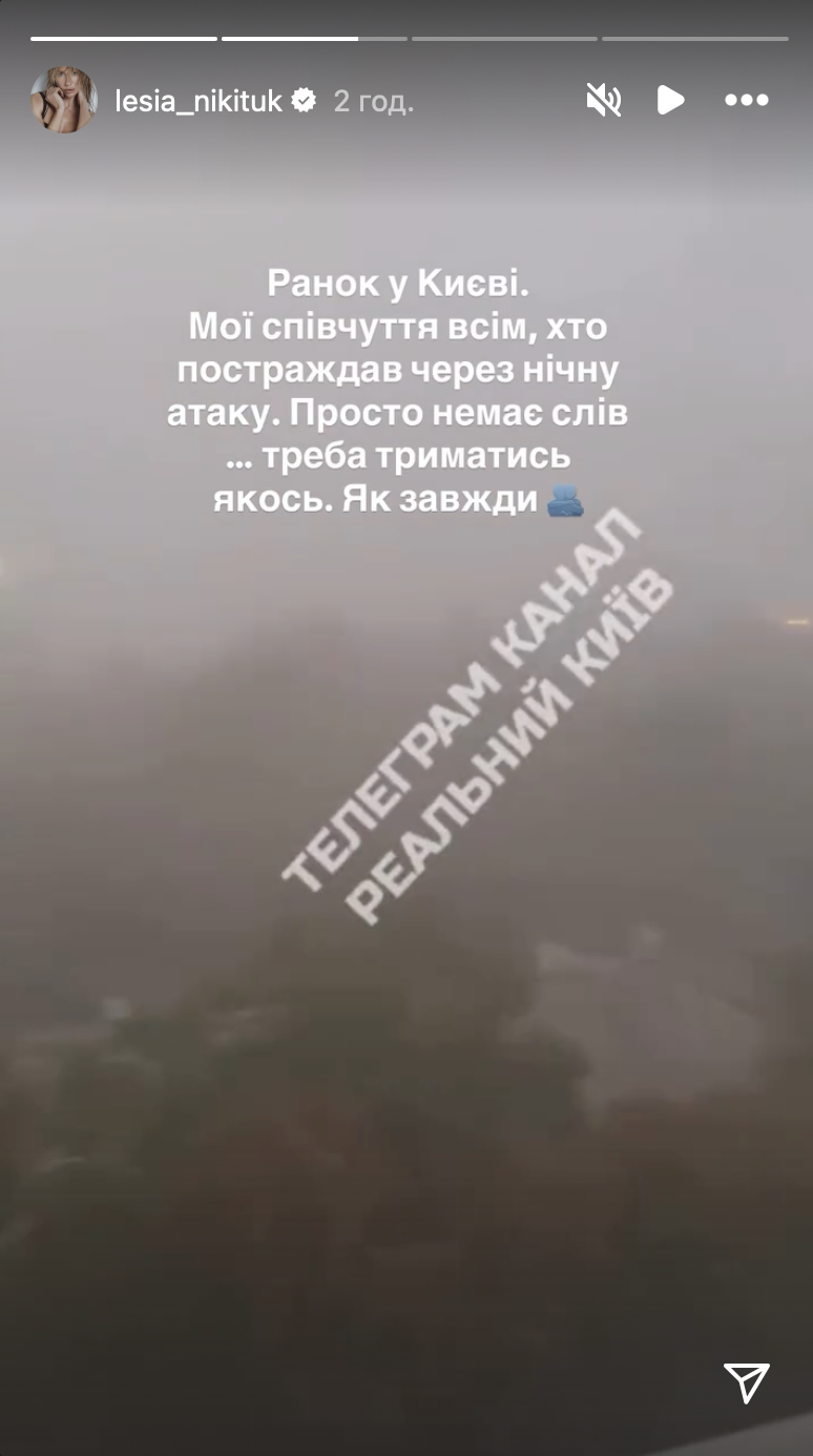 Впоследствии Леся Никитюк выразила соболезнования пострадавшим из-за ракетно-дронового обстрела россиян, показав кадры последствий атаки на фоне задымленного неба: "Утро в Киеве. Мои соболезнования всем, кто пострадал из-за ночной атаки. Просто нет слов — надо держаться как-то. Как всегда".