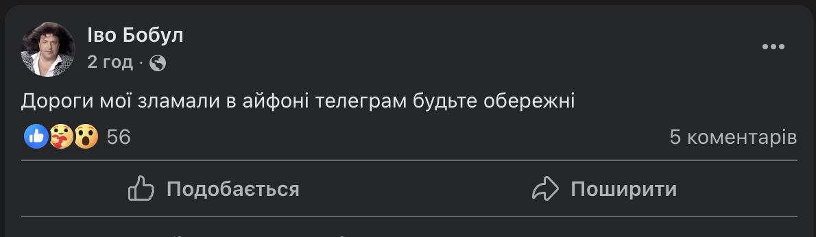 Украинский певец Иво Бобул сообщил, что его аккаунт в Telegram взломали. Артист призвал поклонников быть осторожными