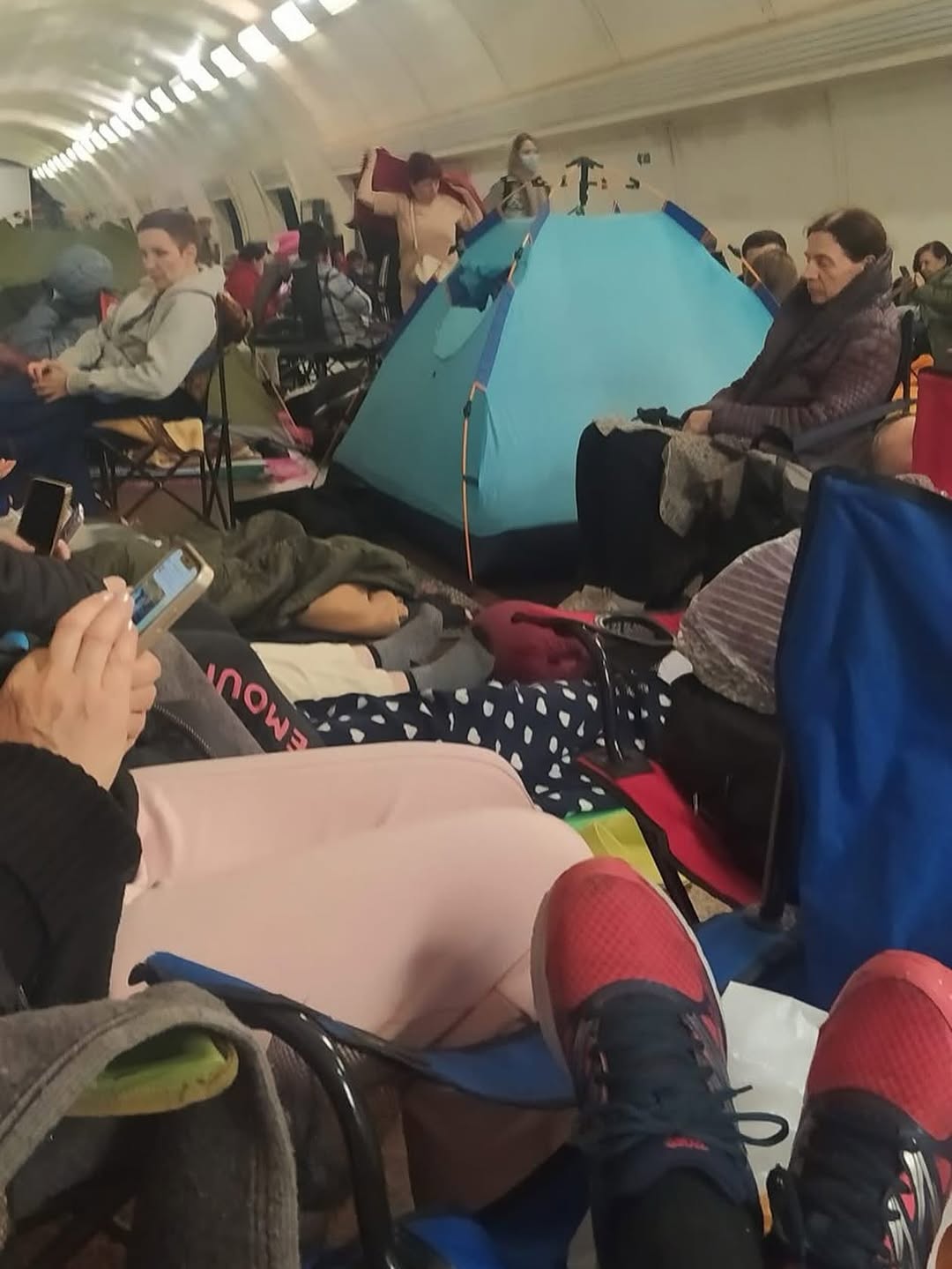 Кадрами, сделанными на одной из станций метро, она поделилась на своей странице в Instagram. На них можно увидеть киевлян, которые пережидают опасность в палатках и раскладных стульях.