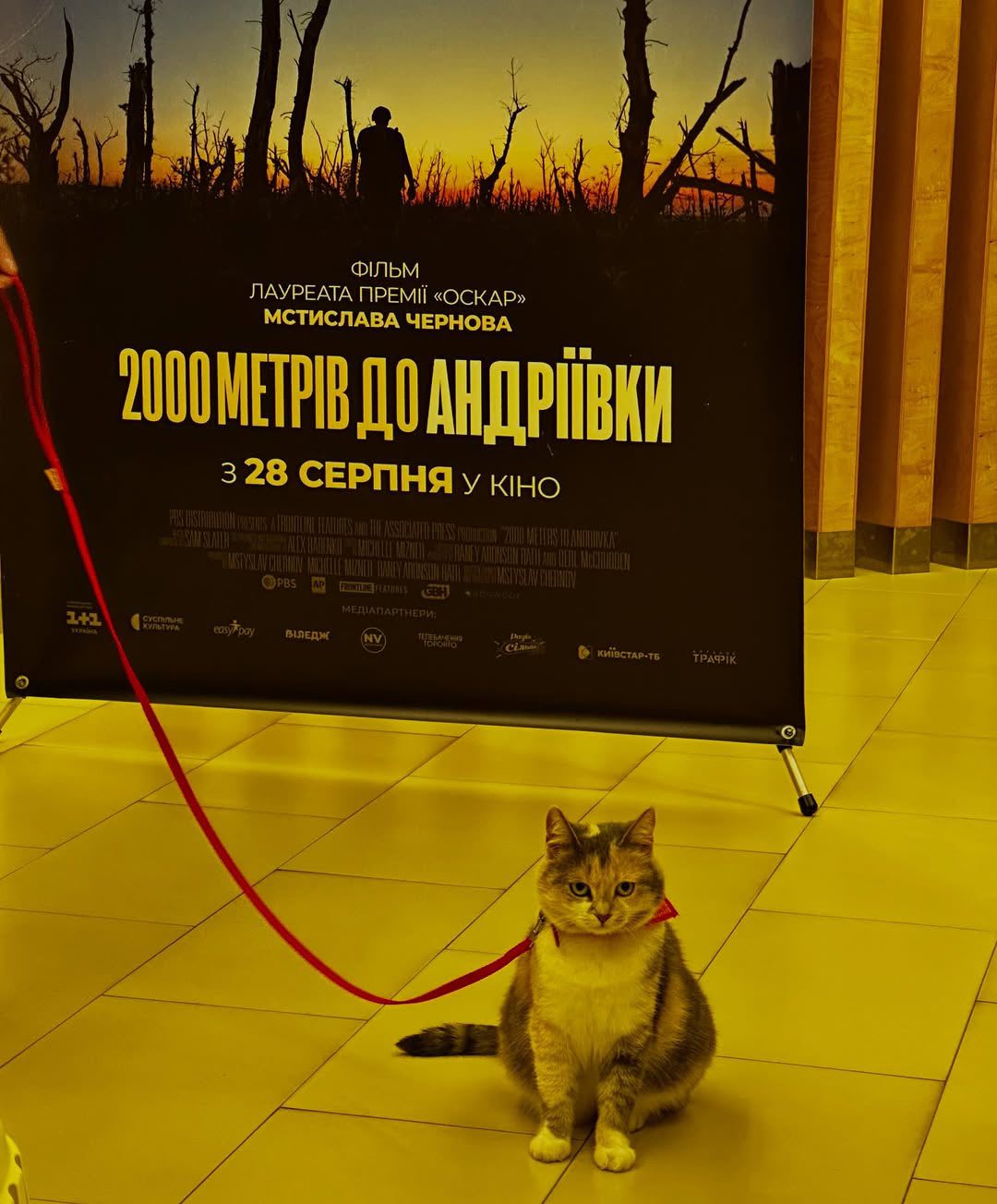 На специальный показ фильма "2000 метров до Андреевки" во Львове пришла кошка, которую и назвали в честь освобожденного в 2023 году села в Донецкой области.