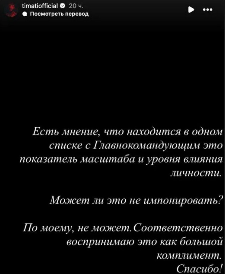 В еще одном сообщении он отметил, что воспринимает свою фамилию в одном списке с главнокомандующим как "показатель масштаба и уровня влияния личности". По словам артиста, он считает это "большим комплиментом".