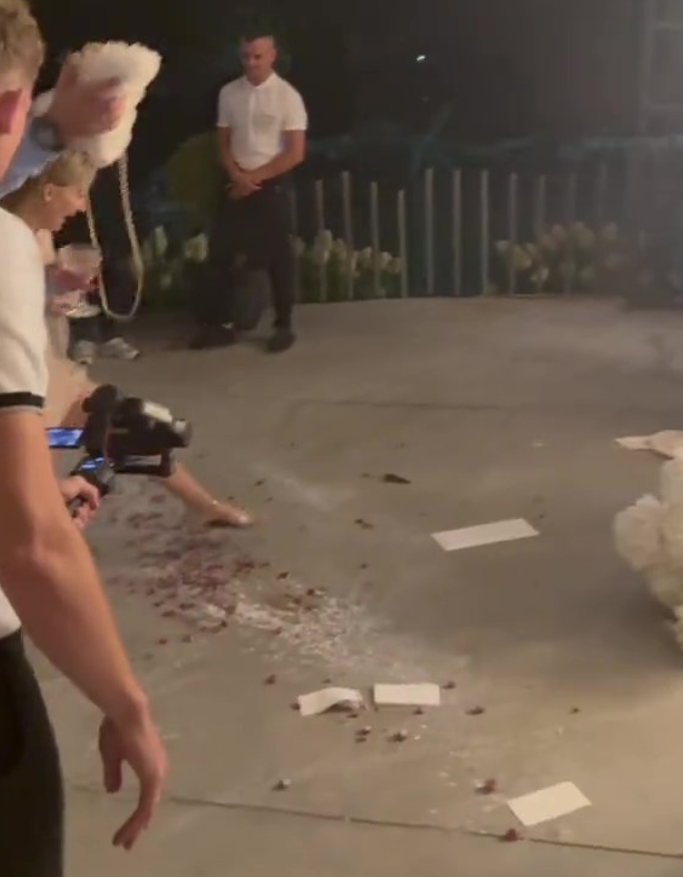 На опубликованных кадрах можно увидеть, как невеста Ольга Чашук вместе со своим возлюбленным сначала украшают торт: высыпают сверху малину и притрушивают сладкой пудрой. В какой-то момент мужчина захотел попробовать десерт и задел пальцем немного крема. Это, очевидно, не понравилось женщине. После ее слов жених со злости сбросил торт со стола.