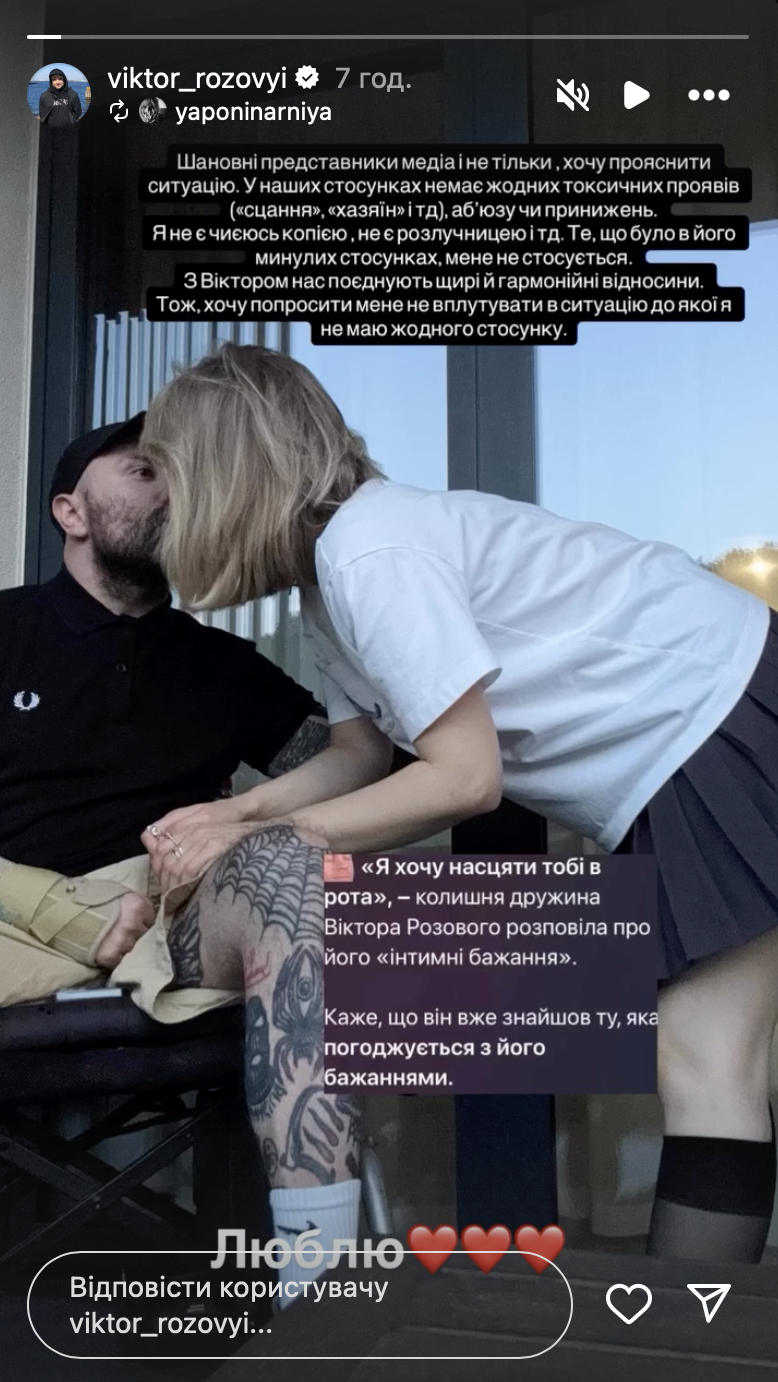 Новая партнерша актера не осталась в стороне и отреагировала на критику в социальных сетях после его интервью Рамине Эсхакзай в августе. Одна из пользовательниц сети написала: "Если вы думали, что хуже измены быть ничего не может, просто скажите спасибо, что ваш парень не Виктор Розовый". На это Яна-Екатерина иронично ответила, что рада строить с ним отношения.